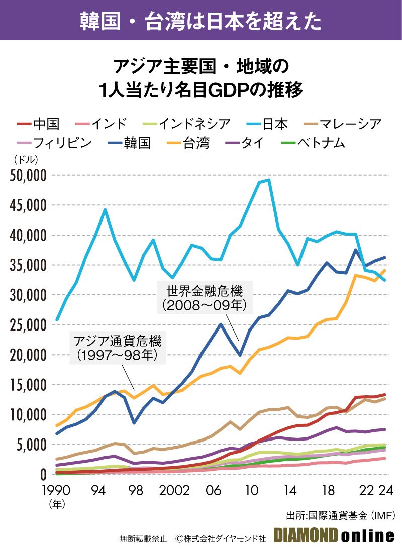 特に、韓国と台湾の1人当たり名目GDPは、97~98年のアジア通貨危機や08~09年の世界金融危機(リーマンショック)の影響を受けつつも順調に伸び続け、24年には韓国が3万6000ドル、台湾が3万4000ドルと、いずれも日本の3万2000 ドルを上回るに至っている。