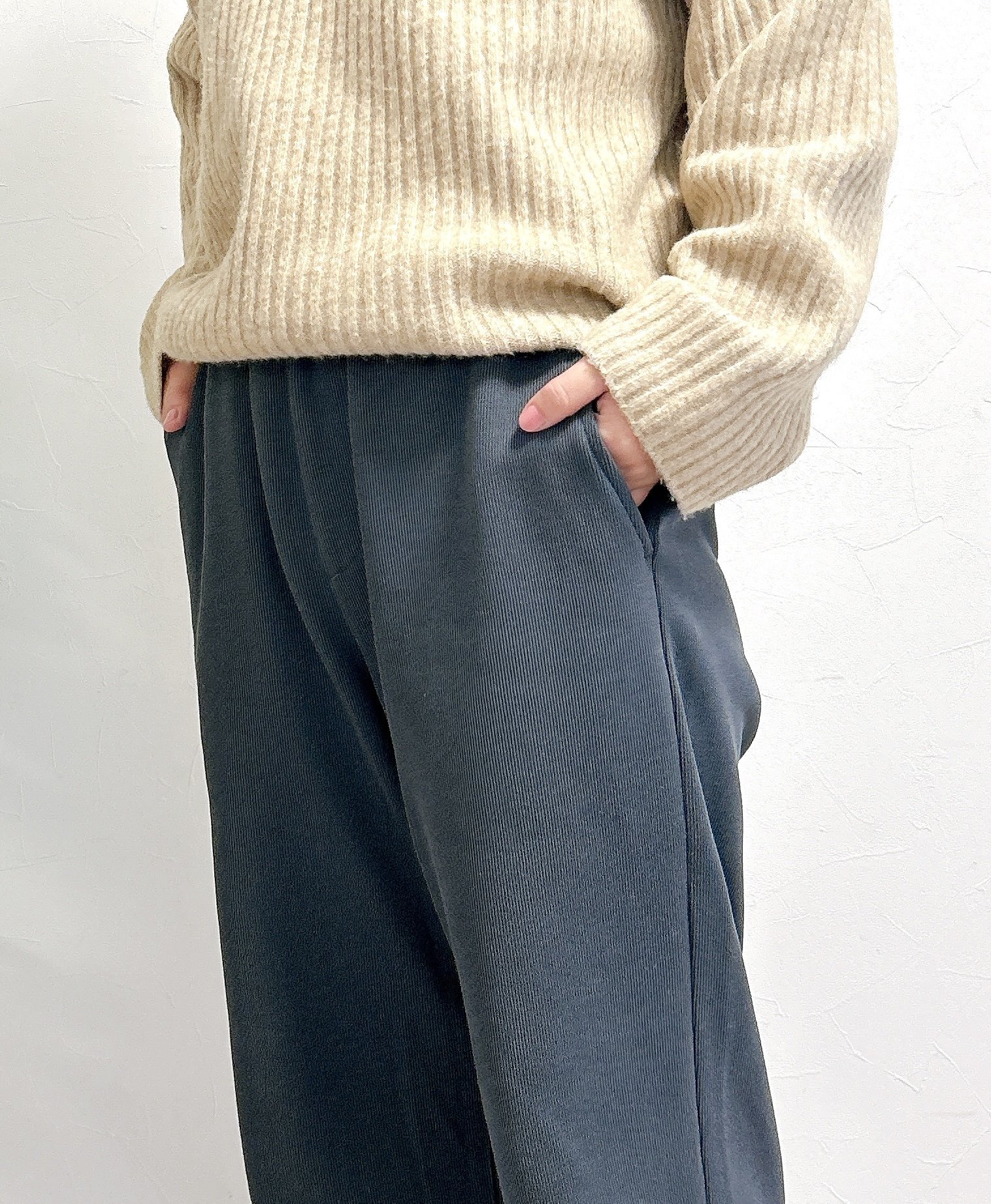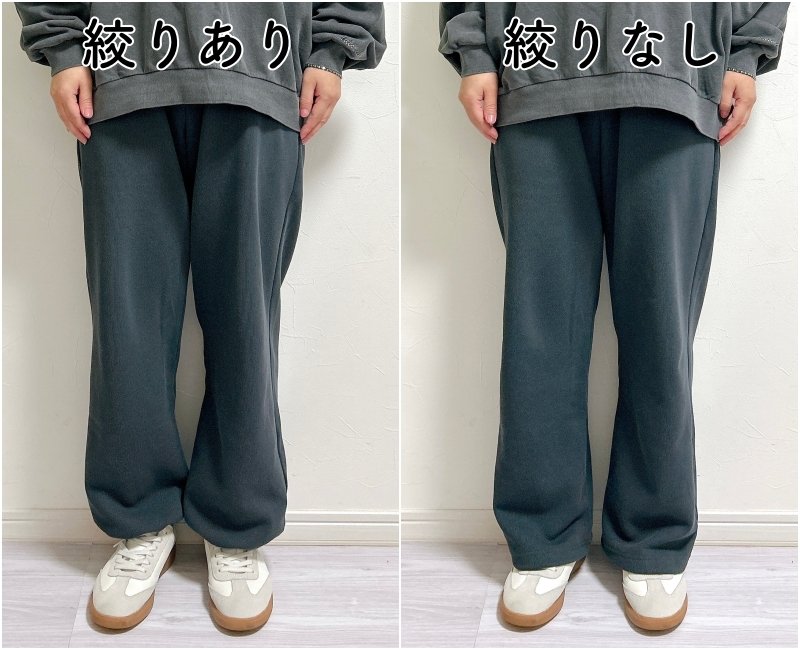 紐を絞るとジョガーパンツのようなクシュッとカジュアルな見た目になり、絞らずに着用するとスラッと脚長のストレートなスタイルになるんです!コーデの幅が広がって、いろんな着こなしに合わせやすいですよ。