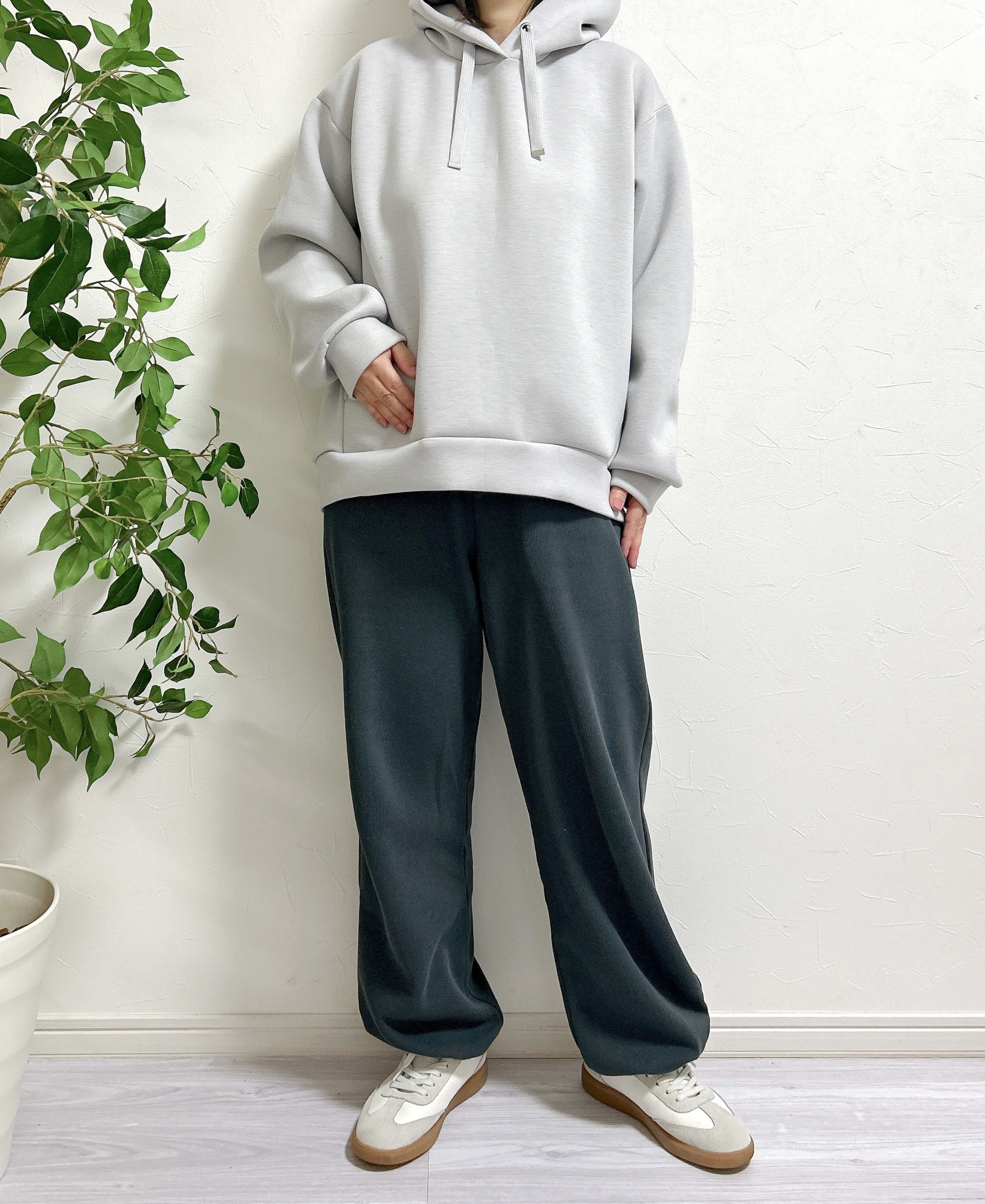 カジュアルにもキレイめにも合うから、コーデを選ばないところが魅力です。シンプルにパーカーと合わせたスタイルも、大人カジュアルにまとまってオシャレ!裾のドローコードでさらにカジュアルアップするなど、変化を楽しめます。
