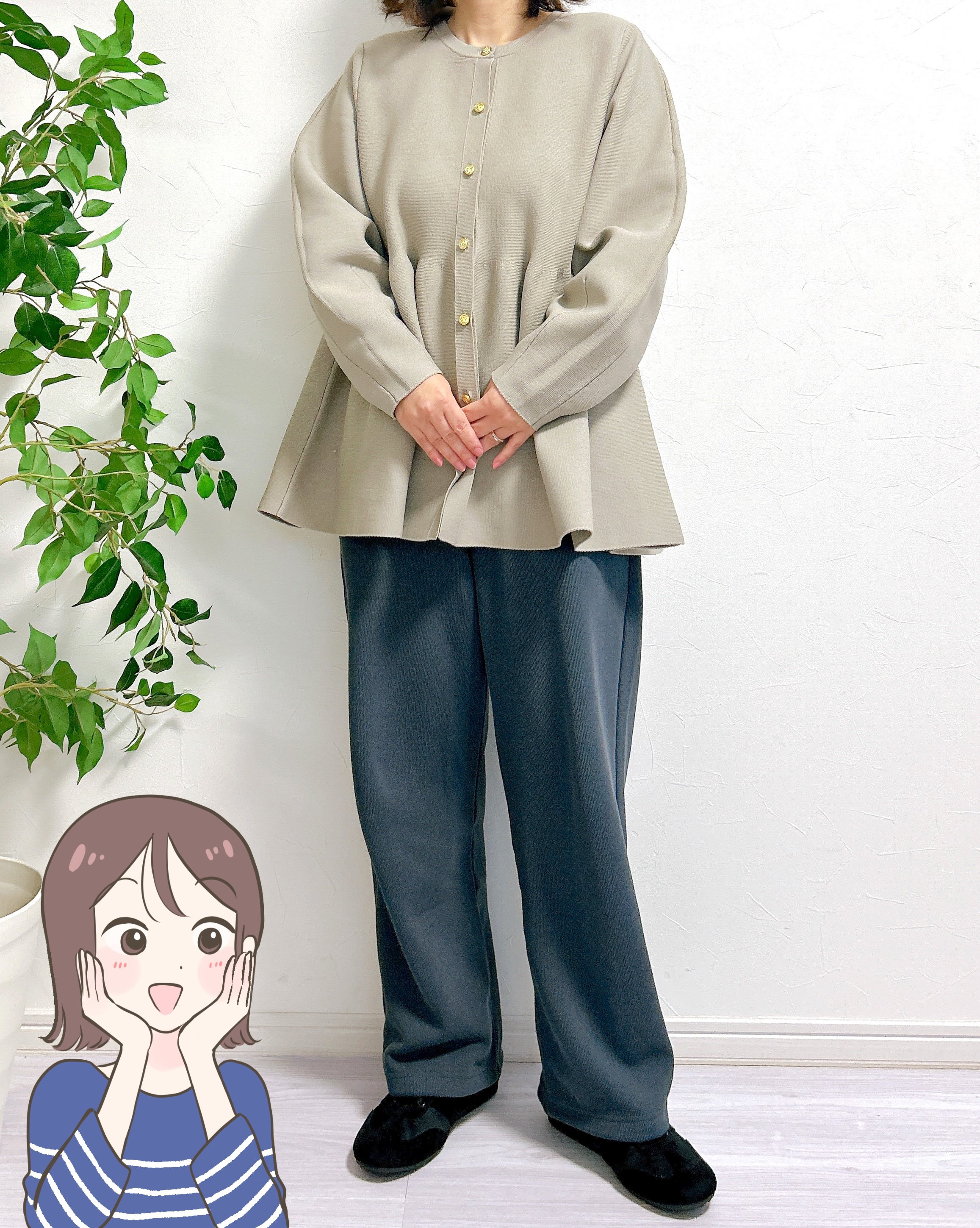 ストレートパンツとワイドパンツの間のようなシルエットで、気になる太ももやお尻まわりをカバーしてくれるのが嬉しいです!