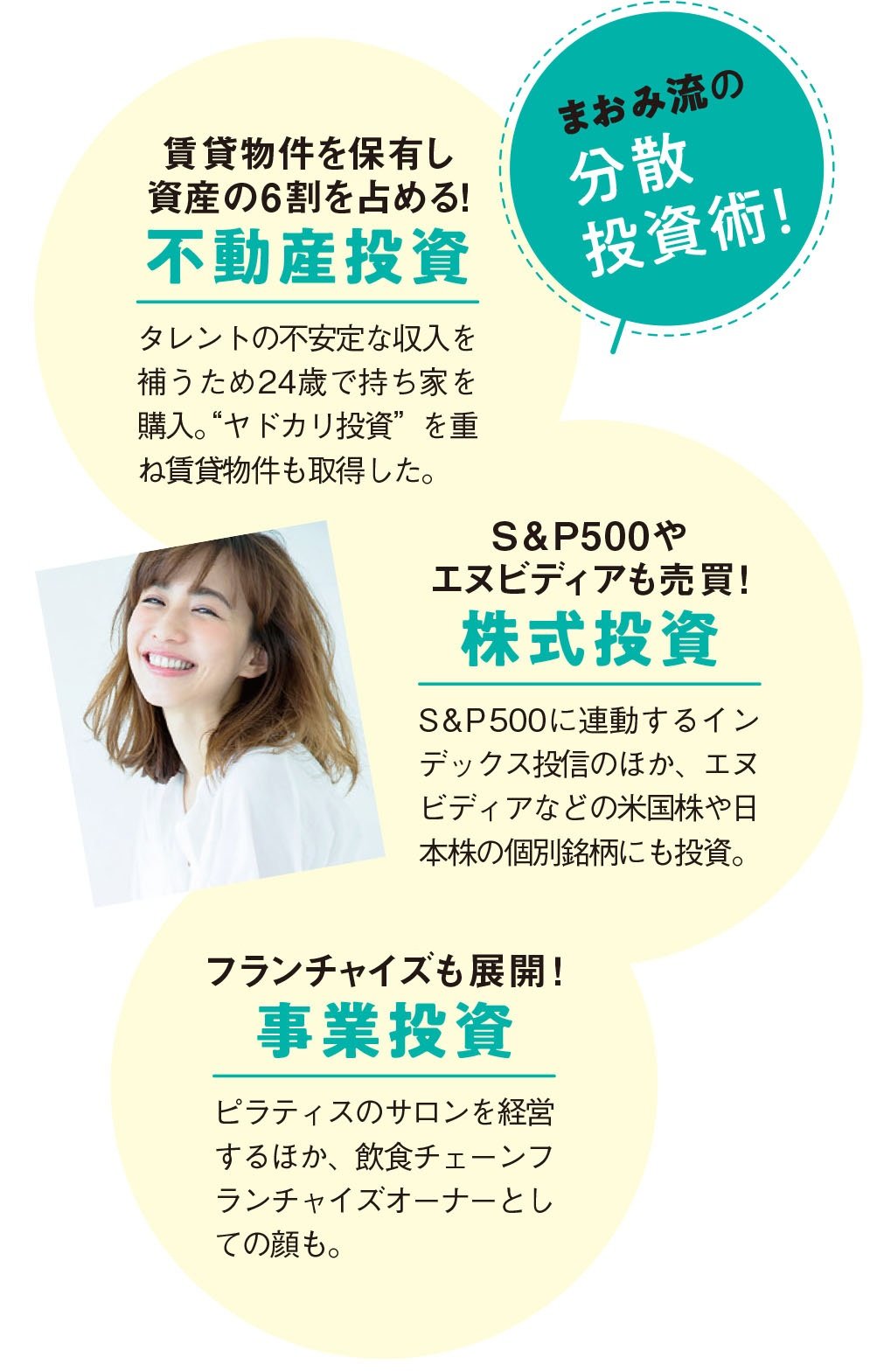 不動産は価値が多少下がることはあっても、ゼロになることはほとんどないので、資産としての安心感があります。安定した家賃収入が得られるのも、不安定になりがちなタレント業や事業の収入を補ってくれるという意味で、とても心強いです。とはいえ、不動産には「売りたいときにすぐ売れない」というリスクもあるので、今後は株式の割合を増やしていきたいと思っています。