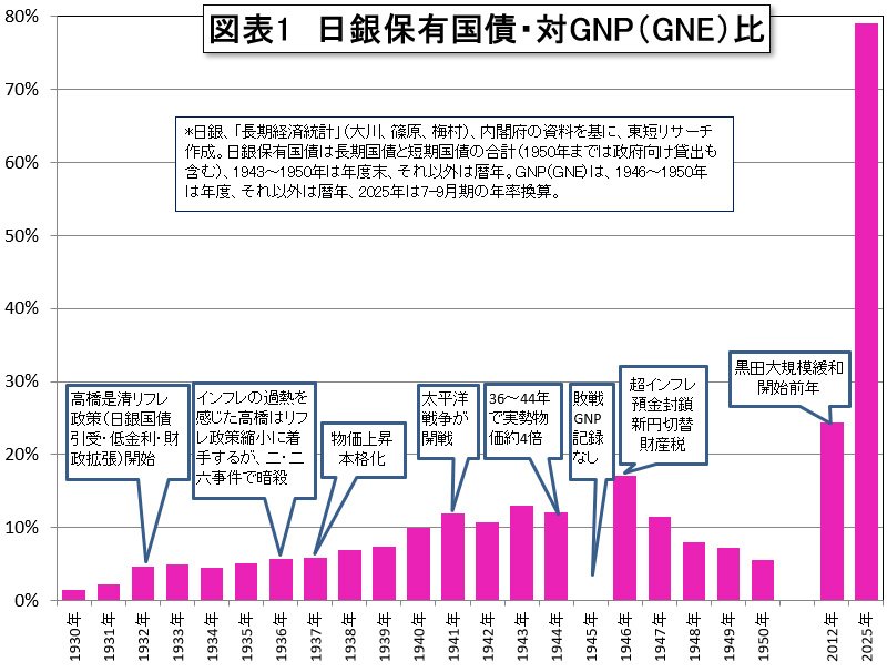 ただし、その政策の下で日銀は、政府から引き受けた国債の大半を市中に売却して資金吸収を行った。図表1で当時の日銀保有額がさほど増えていないように見えるのは、そのためだ。そうしないとインフレを制御できなくなってしまうと当時の人々は心配したからである。