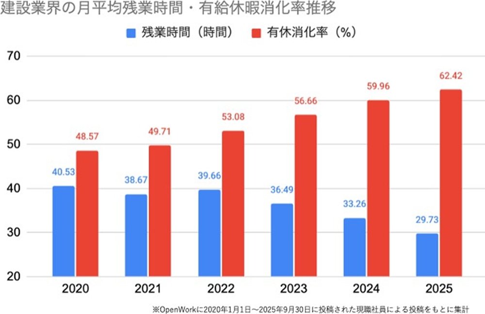オープンワークが運営する、社員・元社員によるクチコミサイト「OpenWork」に寄せられた会社評価レポートを分析すると、建設業界(建築・土木・設備工事)では、この5年間で月平均の残業時間が約10時間減少し、有給休暇消化率は約1.3倍に向上していることが分かる。