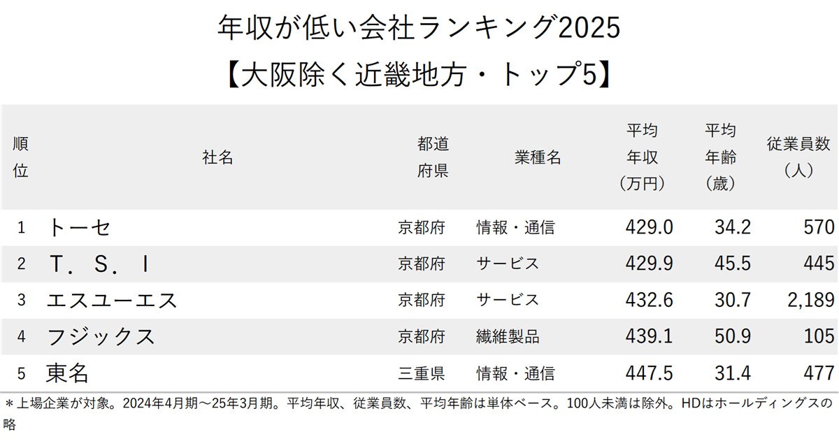 上場企業の有価証券報告書に記載された平均年収のデータを基に、「年収が低い会社ランキング2025【大阪除く近畿地方トップ5】」をお届けする。