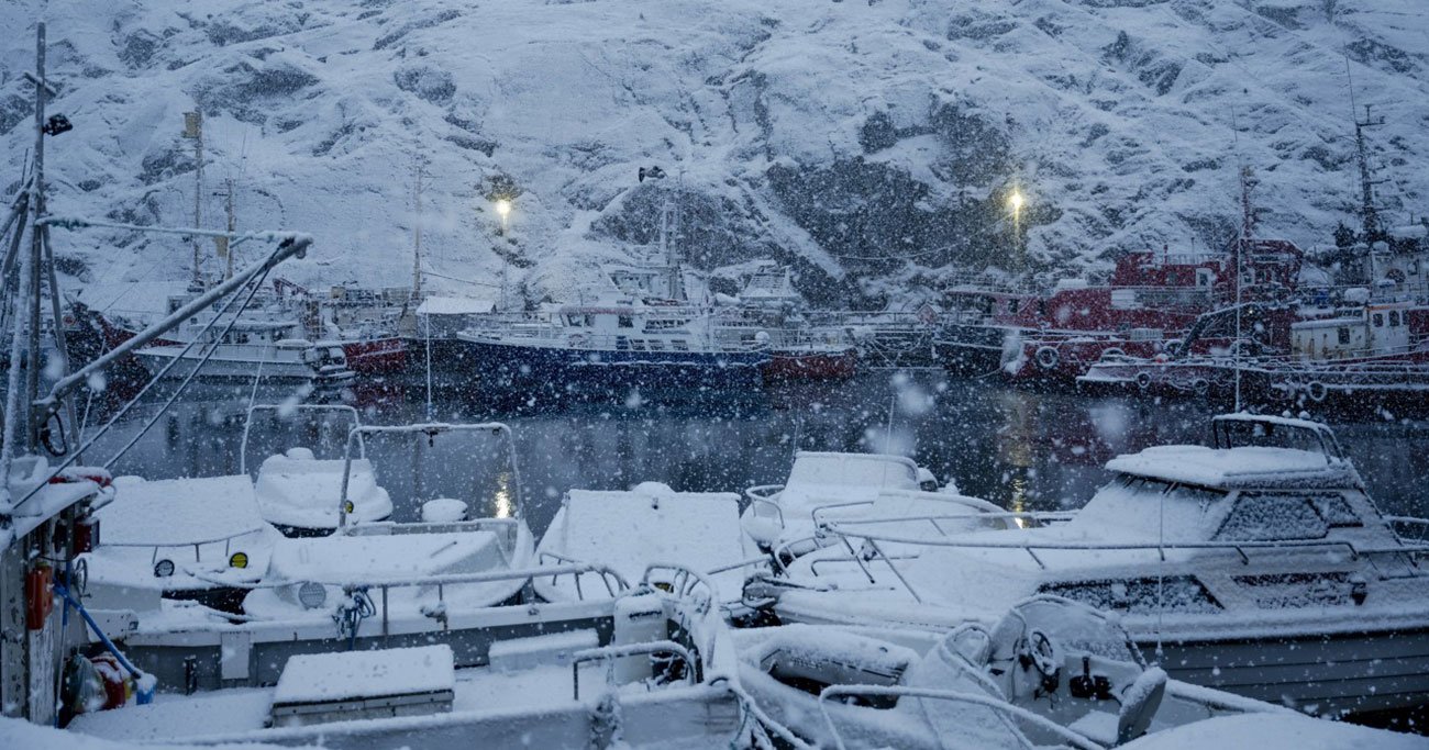 グリーンランドの中心都市ヌークの港に停泊する、雪に覆われた船