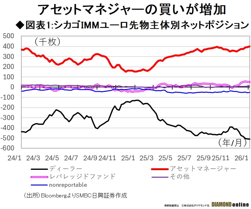 シカゴIMMユーロ先物主体別ネットポジションに注目すれば、その4月の相互関税政策のあたりからアセットマネージャーのユーロロングが急速に積み上がり(図表1参照)、24年までに積極的に積み上げられたドル資産に対するヘッジの形でユーロ買いドル売りが進んだことがうかがえる。
