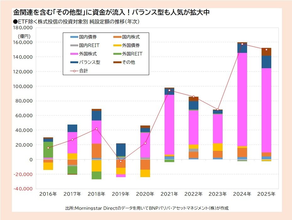 また、「国内株式型」も2024年+1.3兆円から2025年は+0.6兆円に減速していますが、すでに指摘したように株式相場が乱高下した2025年4月以降の利益確定売りや投資家の様子見姿勢などが要因と見られます。