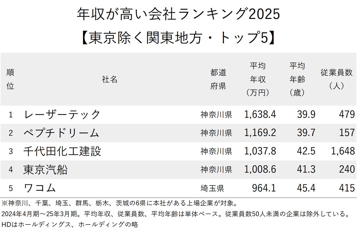 今回は、上場企業の有価証券報告書に記載された平均年収のデータを使って、東京を除く関東地方(神奈川、千葉、埼玉、群馬、栃木、茨城の6県)に本社がある上場企業を対象に「年収が高い会社ランキング2025【東京を除く関東地方】」を作成した。単体の従業員数が50人未満の企業は除外している。対象期間は、2024年4月期~25年3月期。