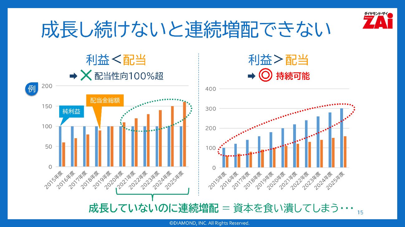 このスライドの左側のグラフを見てください。もし利益が一定で成長していない企業が、無理して増配を続けたらどうなるでしょうか?