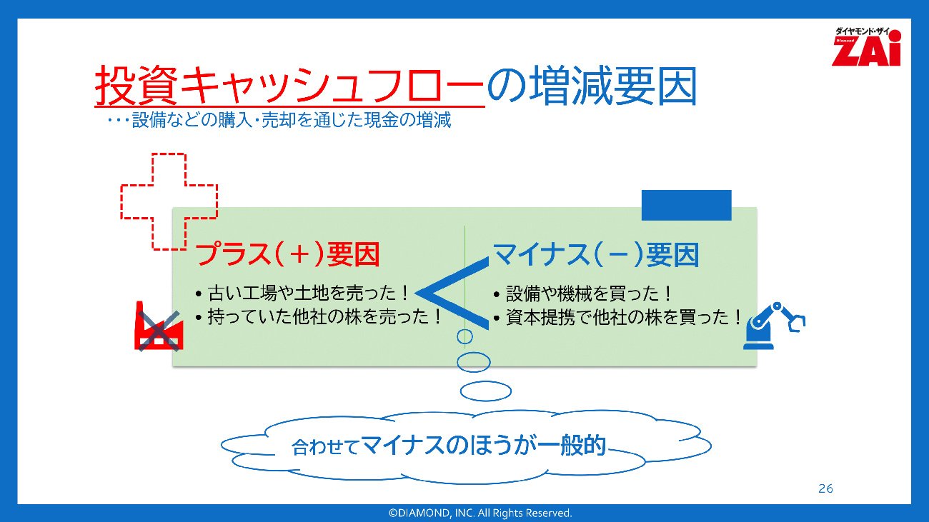 仲村ここは工場を建てたり機械を買ったりすると「お金が出ていく」のでマイナスになります。