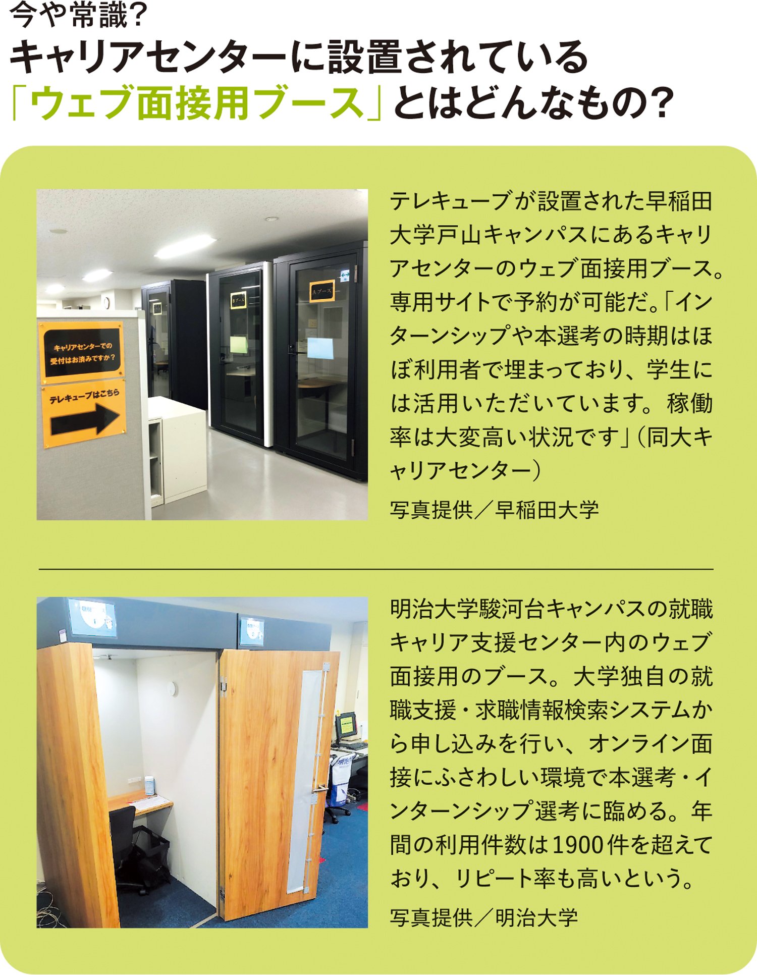 コロナ禍以降急増したオンライン面接の練習をするために、オンライン面接専用のブース(下のコラム参照)を設けている大学もある。