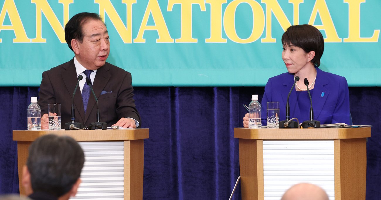 2026年1月26日、日本記者クラブ主催の党首討論会で高市早苗首相(右、自民党総裁)に質問する中道改革連合の野田佳彦共同代表。 Photo:JIJI