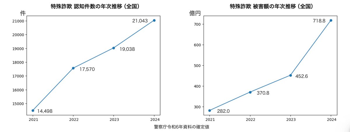 警察庁の資料によれば、2021年から2024年にかけての特殊詐欺の認知件数は約1.45万件→約2.10万件と増加基調にあり、被害額も2024年に前年比+58.8%と大きく跳ね上がった。2025年は11月末までの暫定値だが、それぞれ2万4912件(前年同期比+33.5%)/1213.3億円(同+108.9%)と、さらなる増加を見せている。