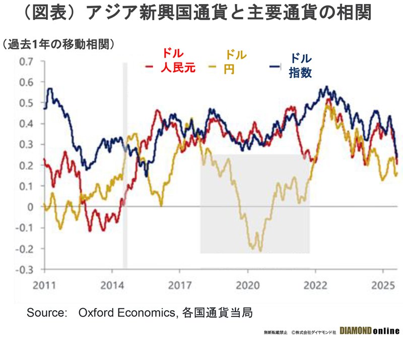 2010年代以降の主なアジア新興国通貨(除く人民元)と主要通貨の相関関係をみると、米ドル指数との相関が一貫して大きい。しかし、2010年代後半からは人民元の対ドルレートの動きとアジア新興国通貨との相関が安定的に高まっている(図表)。