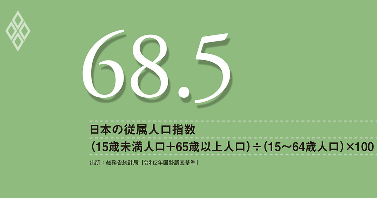 これを端的に捉えるのが「従属人口指数」だ。(年少人口+老年人口)÷生産年齢人口で算出されるように、「働く100人当たりが支える子どもと高齢者の数」を示す、まさに人手不足の代理変数である。