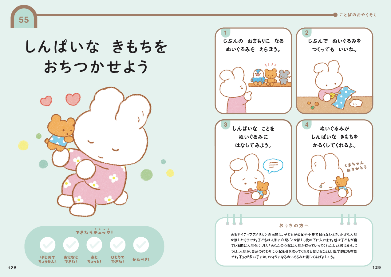 小学校入学前後に身につけておきたい93のおやくそくを紹介した『まいにちがたのしくなるおやくそく できるかな?』の中には「しんぱいなきもちをおちつかせよう」という項目がある。ここでは、「ぬいぐるみで気持ちを落ち着かせる方法」を知ることができる。