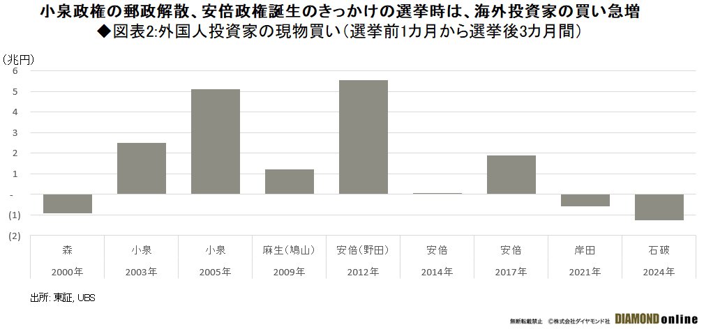 海外投資家は、小泉政権の郵政解散(05年)や第2次安倍政権の誕生のきっかけとなる12年の解散、アベノミクス解散(14年)の時のように、強力なリーダーシップのある政権(改革期待)、政策が分かりやすい政権、長期政権の時に日本株を買い越す傾向にある(図表1、2参照)。