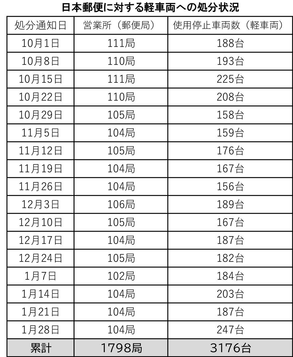 これまでの計17回に及ぶ処分により、累計で1798の郵便局、車両数で3176台が処分を受けたことになる。