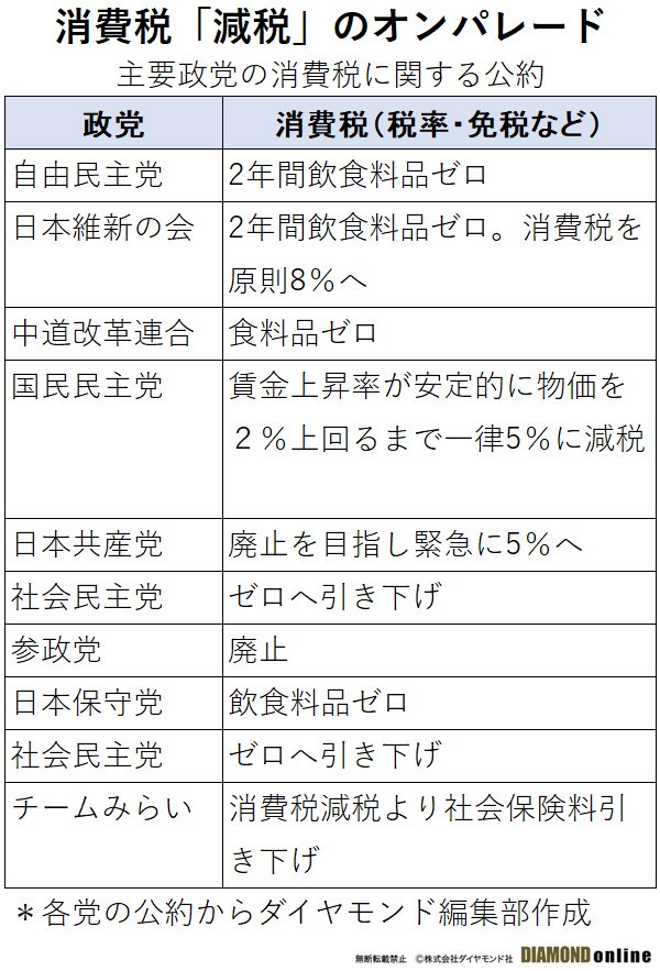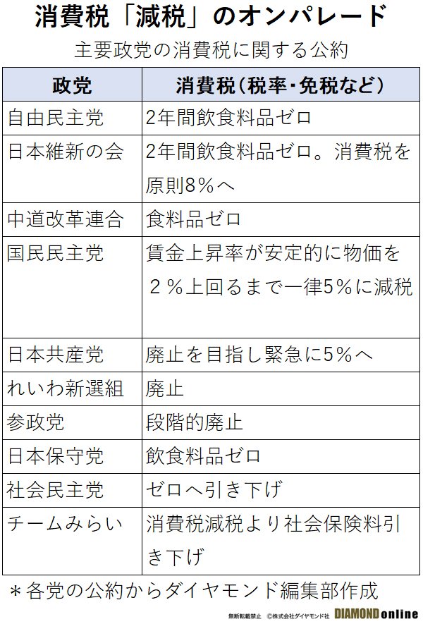 国民民主党は賃金上昇率が物価を常に2%上回る状態で安定的に推移するまでの時限的措置として消費税率を一律5%にするとした。参政党と社民党、れいわ新選組、日本保守党は消費税廃止。共産党は5%に減税した後に廃止と公約に掲げている。