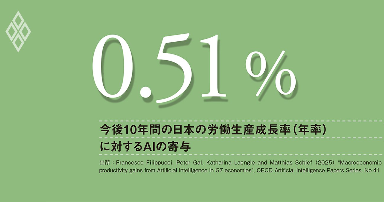 一方、日本経済がAIから受ける恩恵は、米国に比べ小さいとの見方が多い。例えば、G7(先進7カ国)諸国を対象としたOECD(経済協力開発機構)の試算によると、AI技術がコンピューターやインターネット並みのスピードで普及すると想定した場合、今後10年間の生産性押し上げ効果は日本で年率0.51%と、米国(同0.99%)の半分程度にとどまると予想されている。