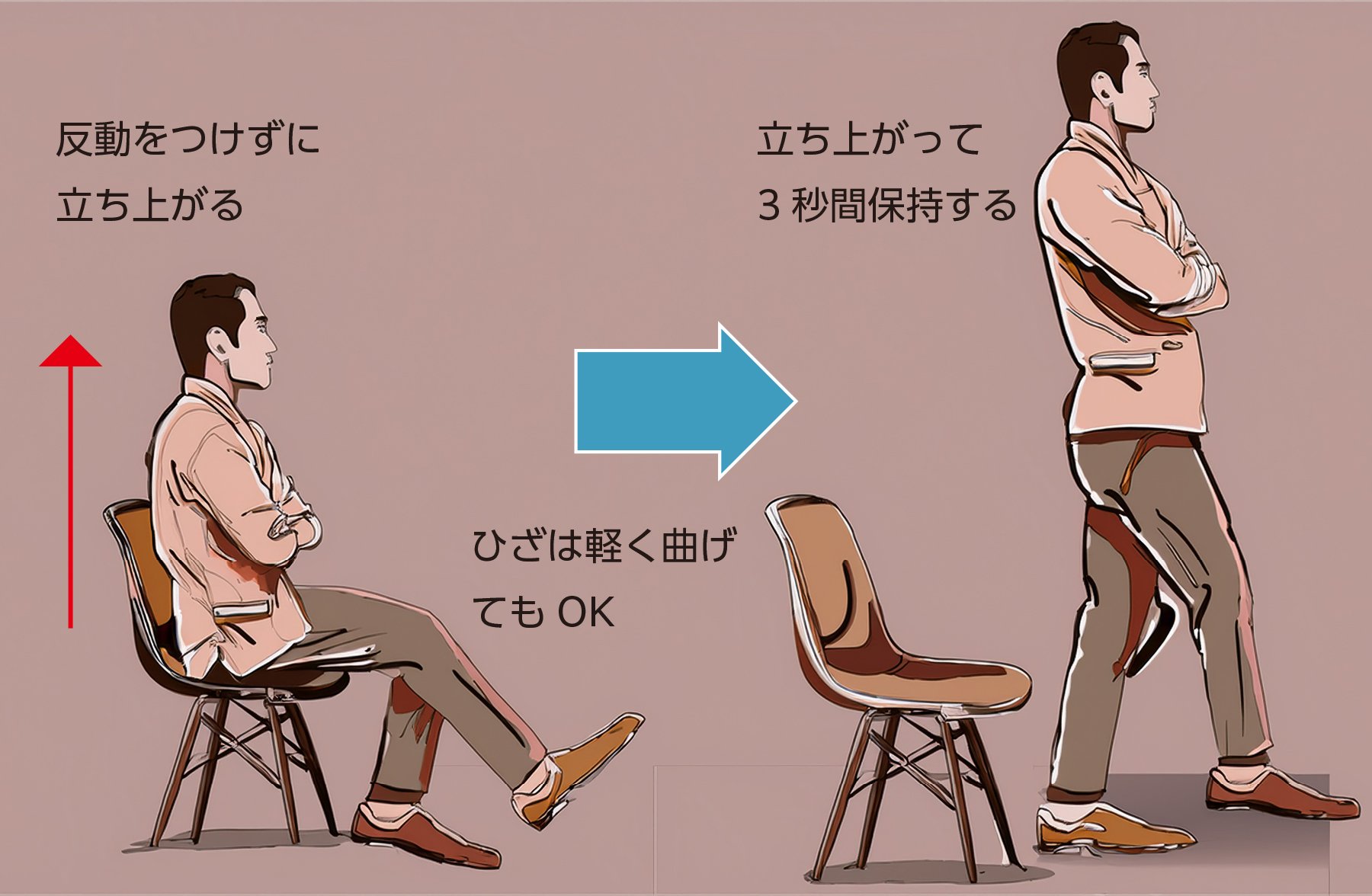 40cmの台や椅子に両腕を組んで腰かける。両脚を肩幅くらいに広げて反動をつけずに立ち上がり、そのまま3秒間保持する。