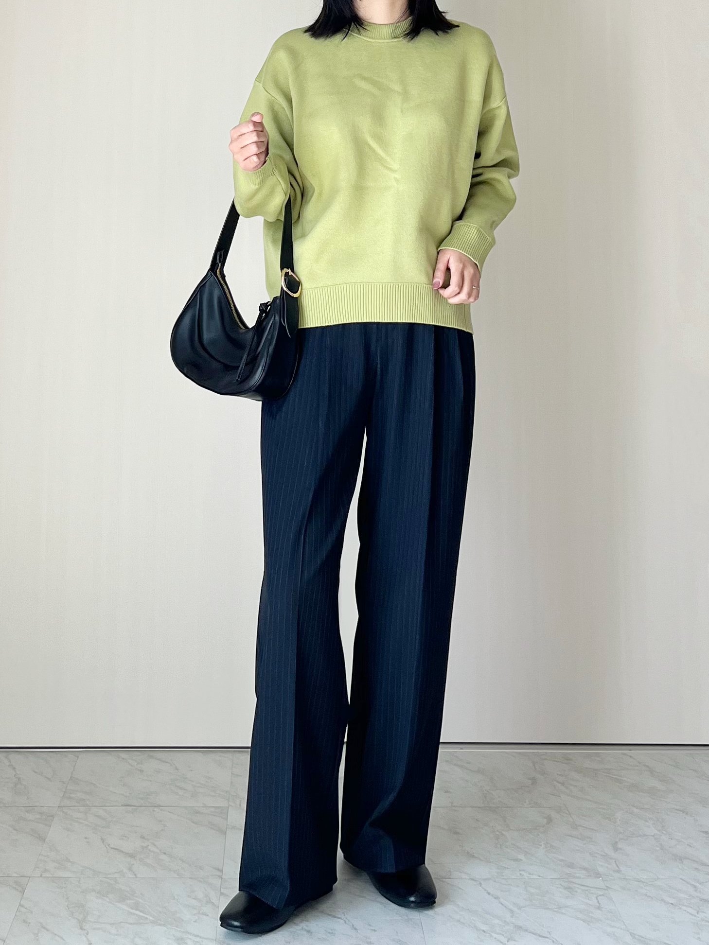 スウェットライクなニットと合わせると、休日のお出かけコーデが完成。パンツが暗いネイビーなので、トップスに明るい色を着ると華やかさが強調されて可愛いです。