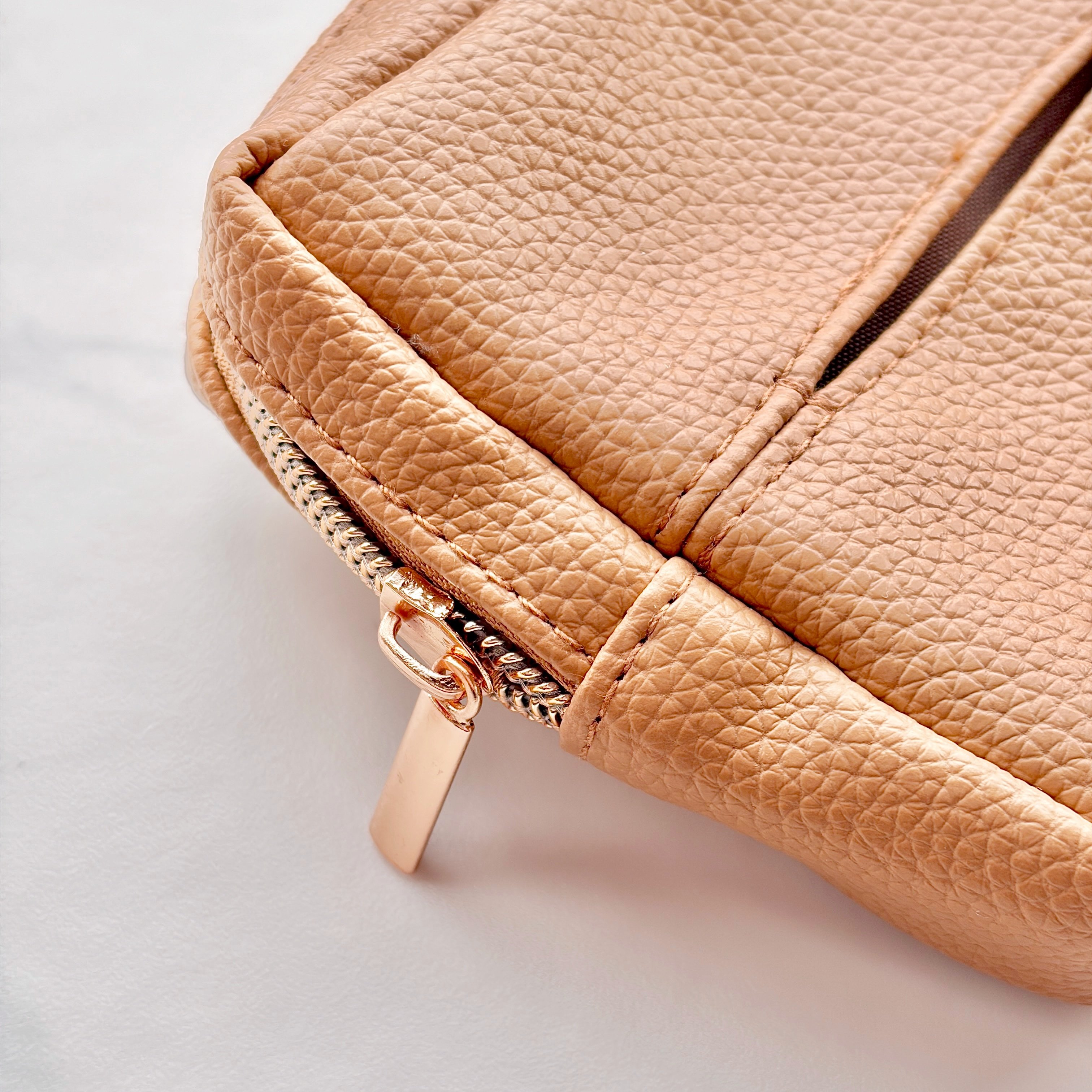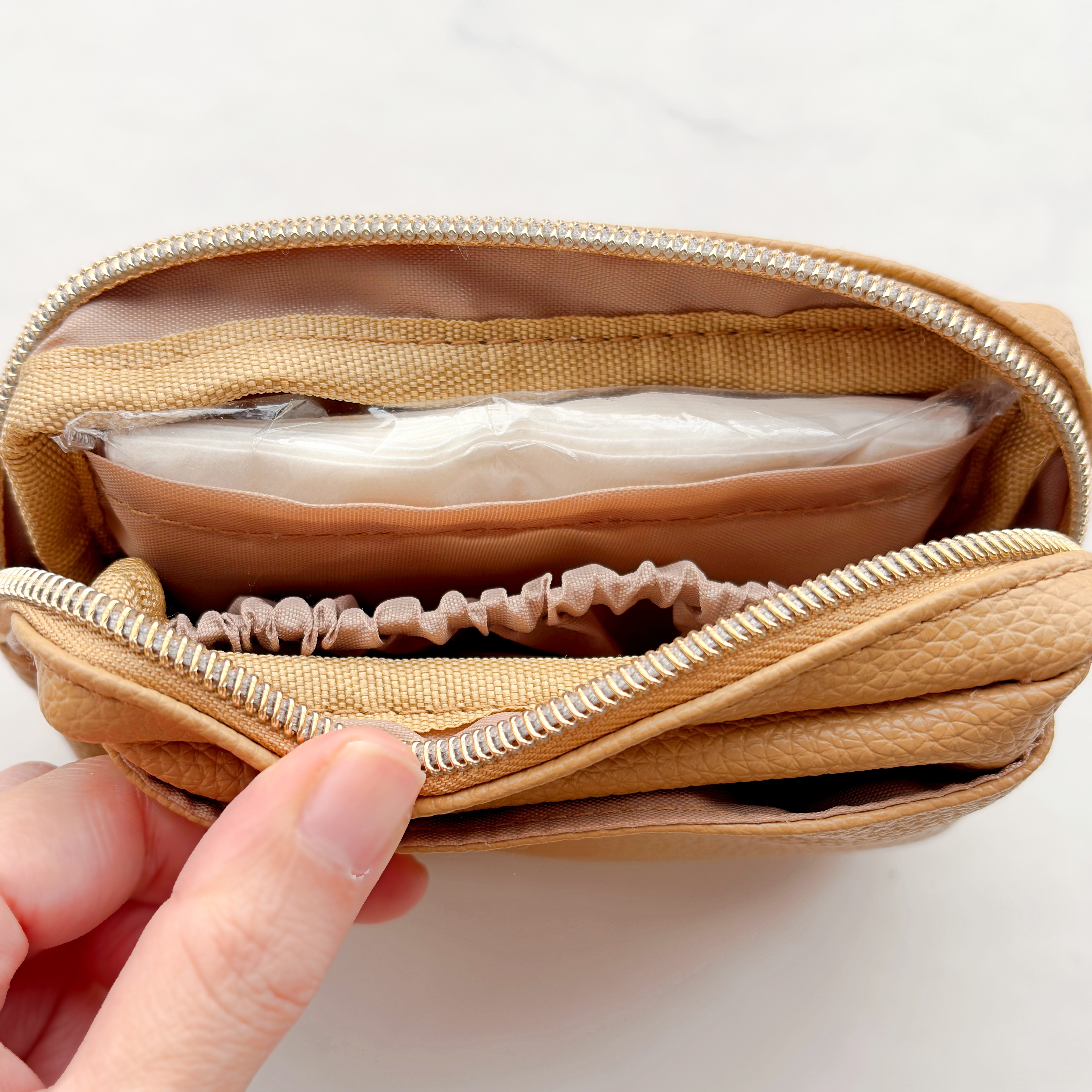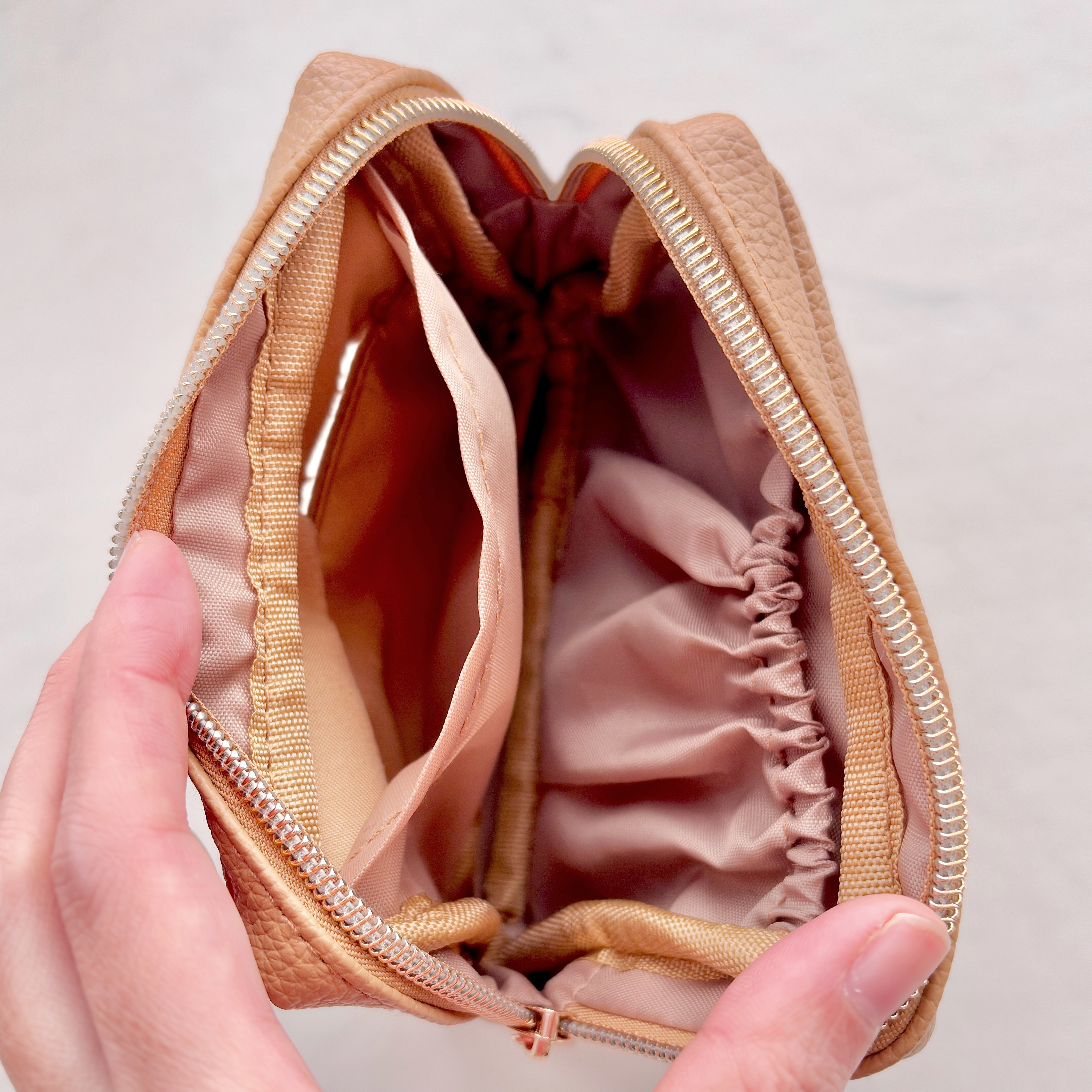 内側にはティッシュを入れる仕切り付きのスペースと内ポケットが1つありました。内布もキャメル色で、生地が光を反射して中身が見やすい。ファスナーが側面まであるため、ガバッと開いて出し入れも楽ちんです。