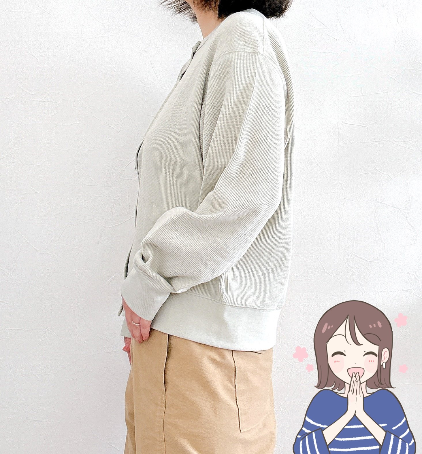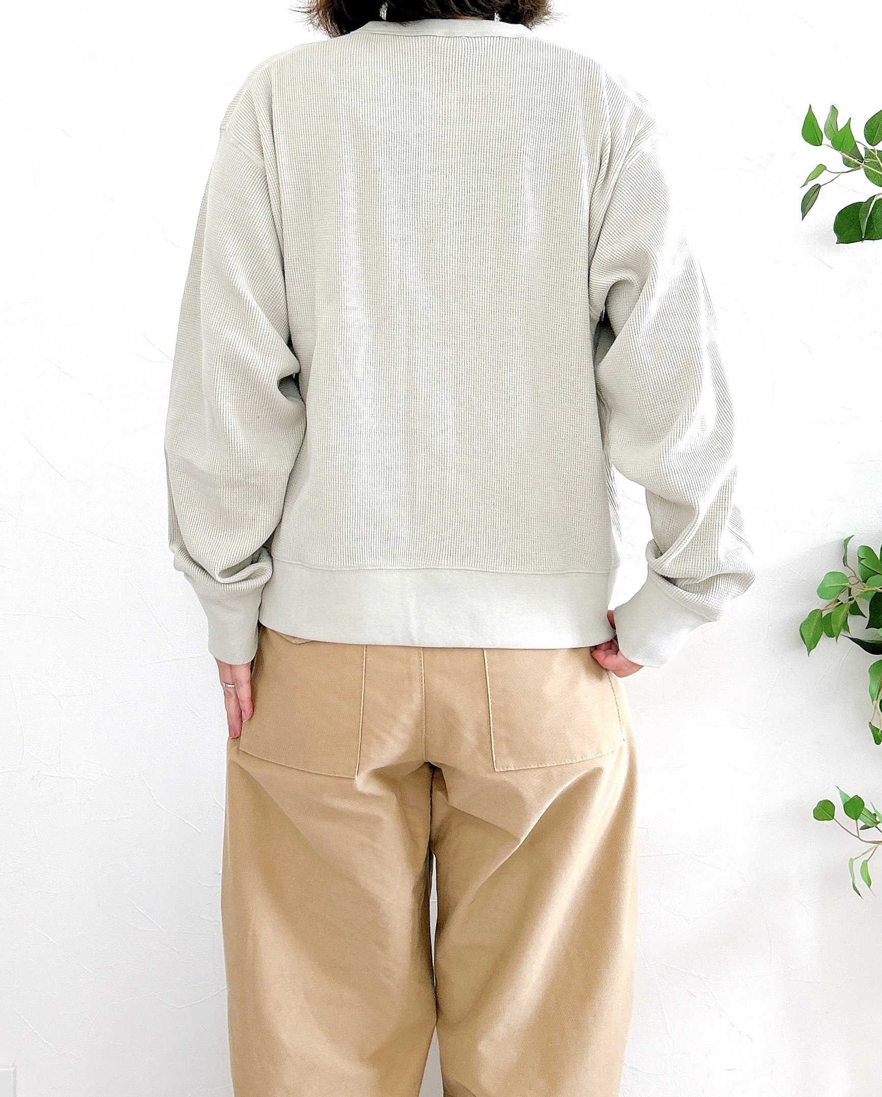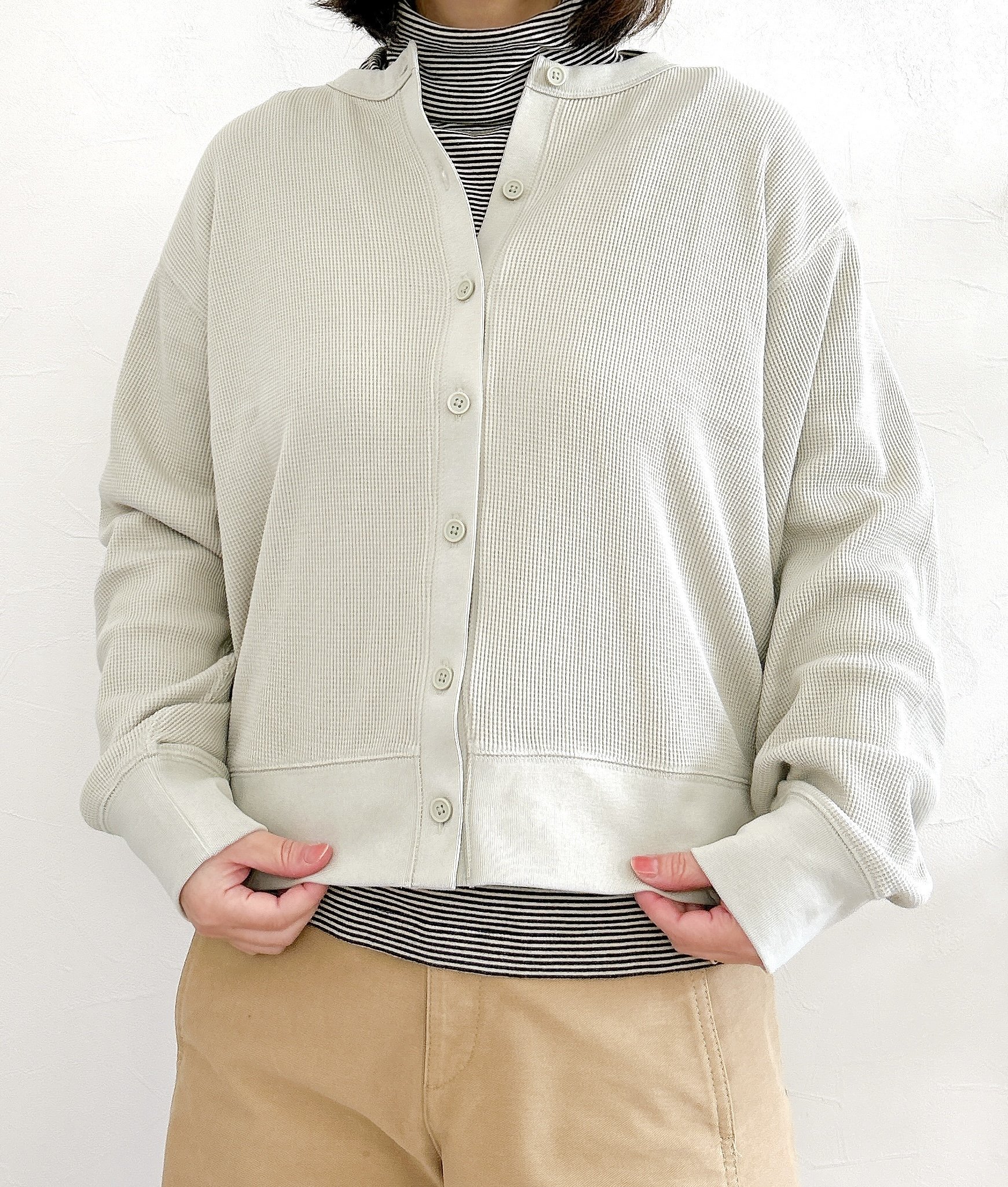 丸まりがちな背中も、ワッフル編みのデザインで立体感が生まれ、スラッとした印象にしてくれますよ!