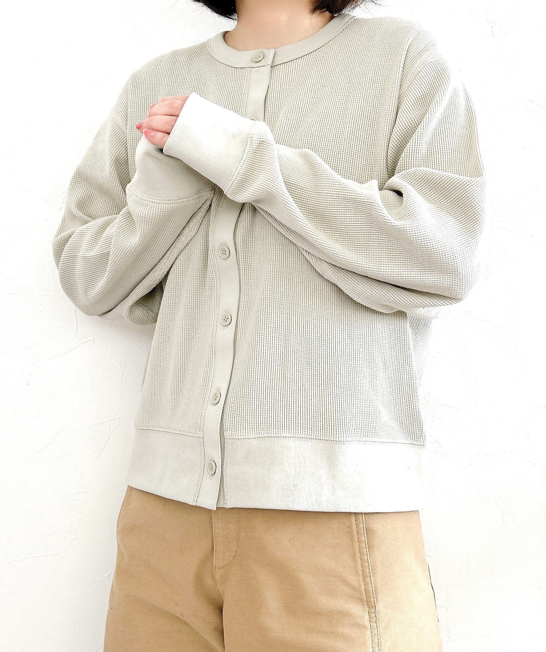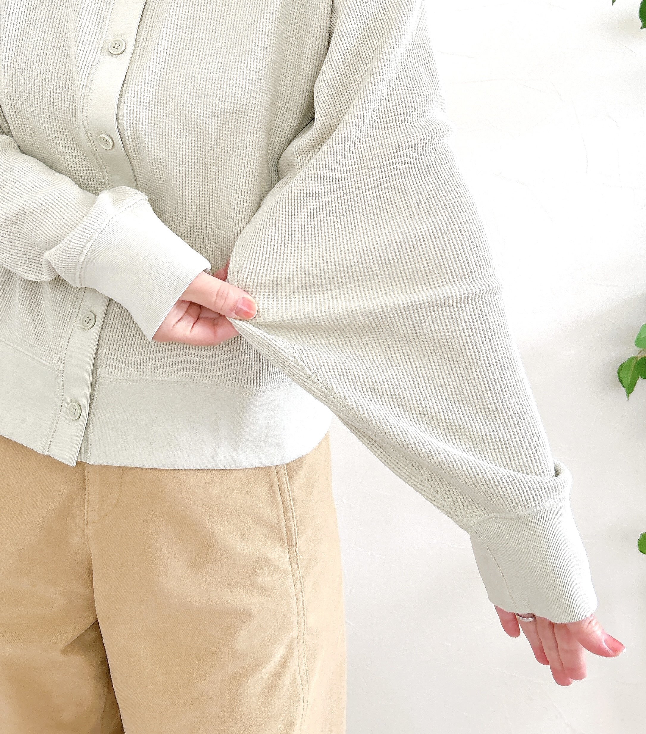 また、袖と裾のリブは長めに入ったデザイン。そのおかげで、手首とヒップまわりがキュッと引き締まって見えるんです!袖丈もやや長めの作りで、全体的にトレンド感のあるデザインだなと思いました。