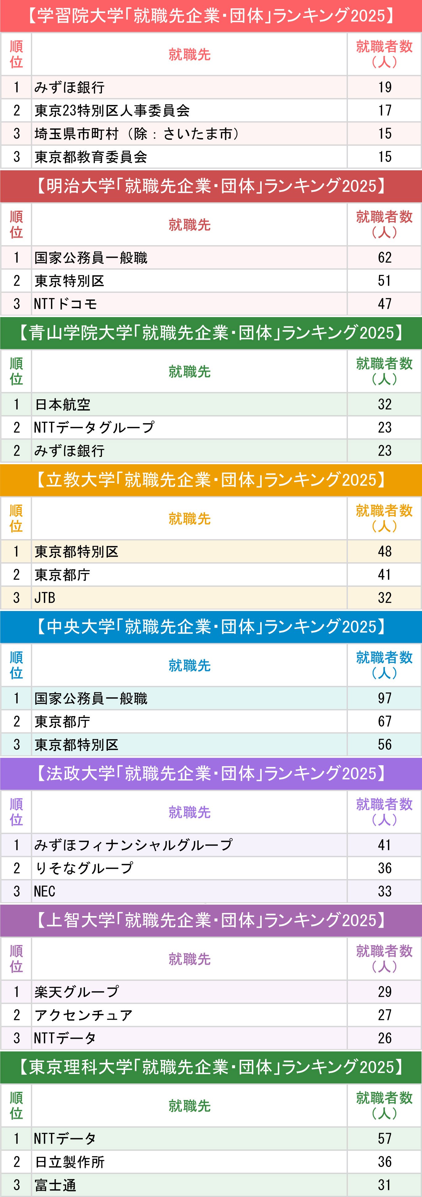 24年のGMARCH+上智・理科大の「就職先企業・団体」ランキングにおける各校のトップは、学習院大学は東京23特別区人事委員会、明治大学と立教大学は東京特別区、青山学院大学は日本航空、中央大学は国家公務員(一般職)、法政大学はみずほフィナンシャルグループ、上智大学はアクセンチュア、東京理科大学はNTTデータだった。