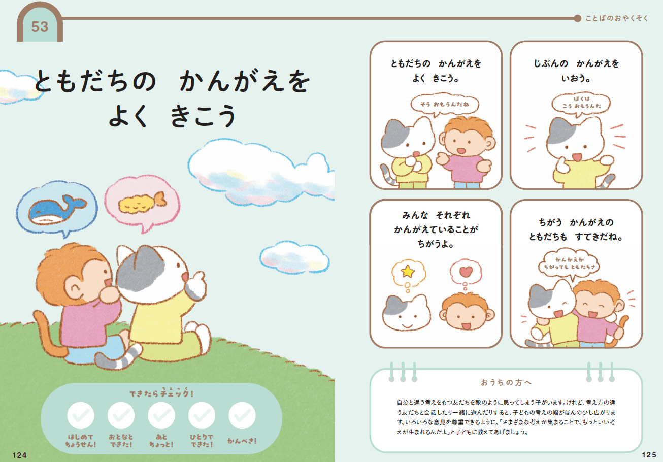 (『まいにちがたのしくなるおやくそく できるかな?』p.125)特に、相手の意見を聞くだけでなく「自分の考えを言う」ことも等しく大切だと伝えている点がポイントだ。相手を尊重しながらも、自分の思いを言葉にする。それが「できた!」という成功体験は、子どもの確かな自信へとつながっていくだろう。娘も、自分の意見を言えたことがきっかけで、友だちとのコミュニケーションに自信を持てるようになった。