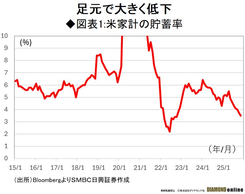 ここで興味深いのは、堅調な消費が観測された25年11月の米家計の貯蓄率(3.5%)である。(図表1参照)