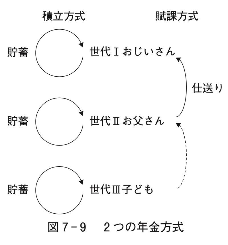 賦課方式では最初の世代(1)は負担を行わず、次の世代(2)から移転を受けます。次の世代(2)は、その次の世代(3)から移転を受けることを期待するわけですが、ここで積立方式に切り替えると、世代(2)は第(1)世代の年金をまかなったばかりか、自分の世代の年金も積立てねばならず、この世代だけが二重負担となるからです(図7-9)。