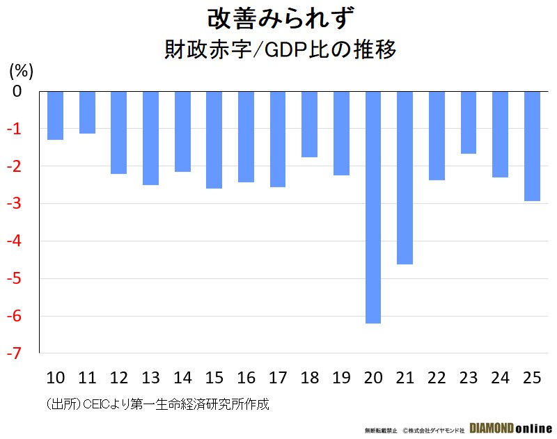2025年の財政赤字が695.1兆ルピア、対GDP(国内総生産)比2.92%と法定上限である同3%に近づき、コロナ禍対応に追われた20年と21年を除けば、約20年ぶりの高水準となるなど、財政状況は急速に悪化している。