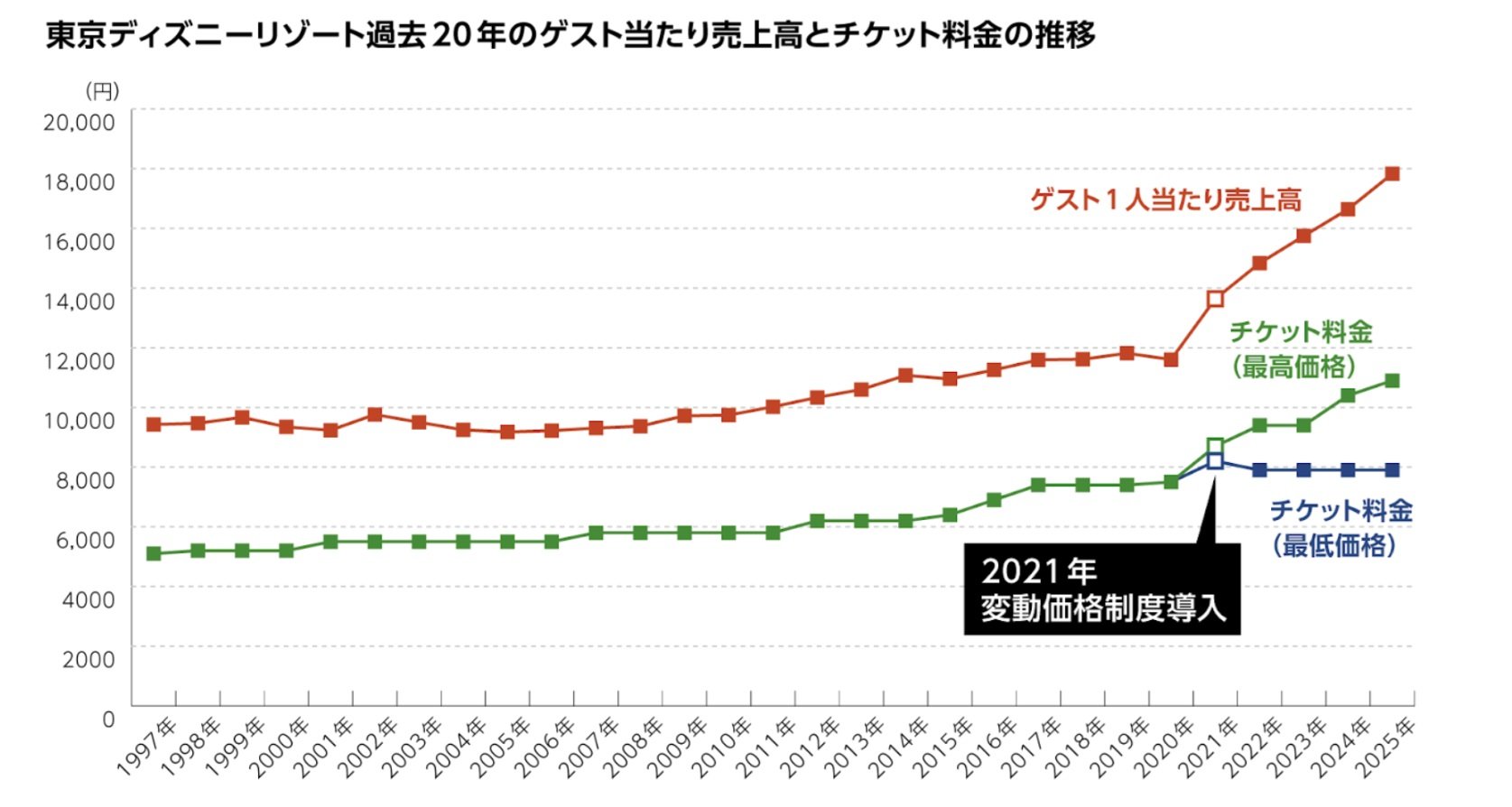 2021年には変動価格制が導入されました。コロナ前(2019年3月)のチケット料金(ワンデーパスポート、大人)は一律7400円でしたが、現在は7900~1万900円と最高価格は1万円を超えています。