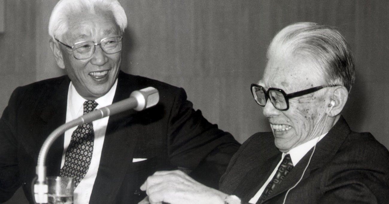 ソニー創業者の井深大さんと盛田昭夫さんのモノづくりの原点は戦争を経験し「この焼け野原から立ち直って、若い人たちに豊かな世界を渡したい」というものだった(写真は井深氏=写真右が文化勲章を受賞し、2人で喜ぶ盛田氏) Photo:SANKEI