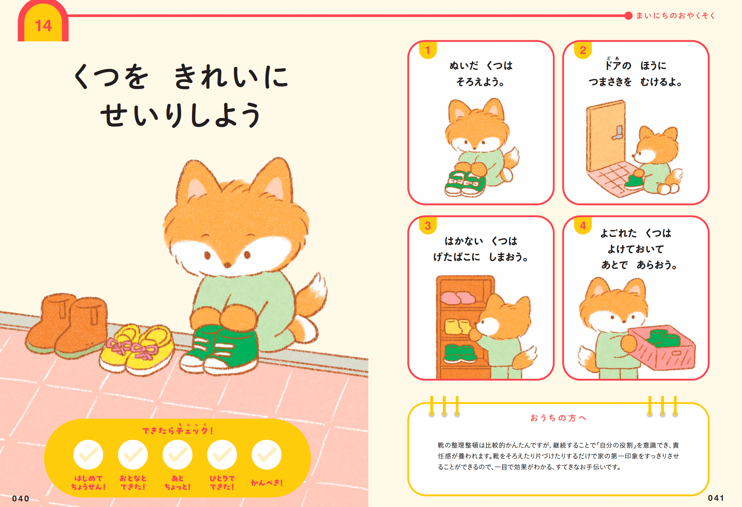 小学校入学前後に知っておきたい93のおやくそくを学べる本『まいにちがたのしくなるおやくそく できるかな?』には、「くつをきれいにせいりしよう」という項目がある。靴のそろえ方だけでなく、日々の管理の仕方まで具体的に説明されている。