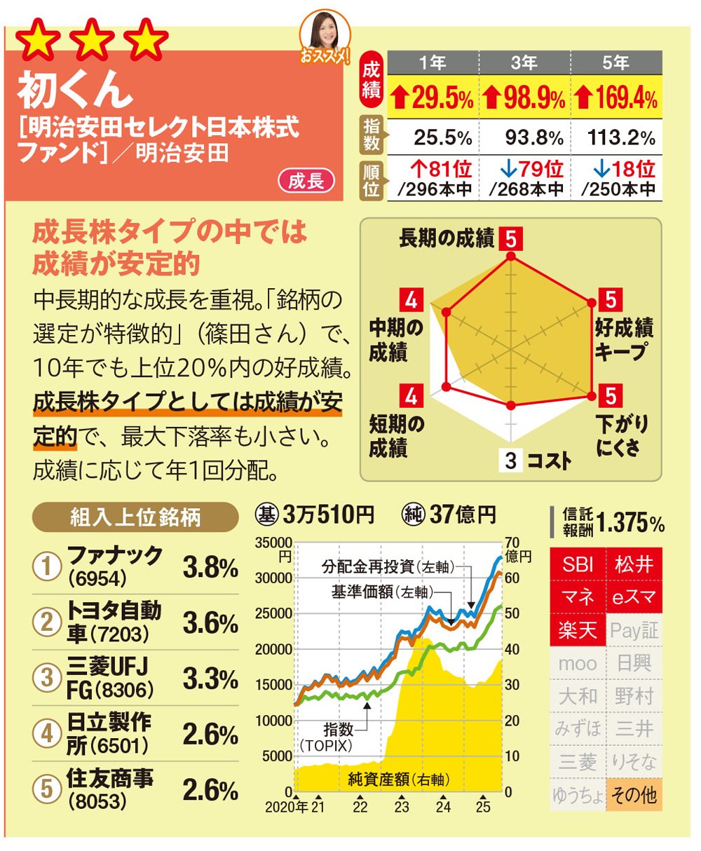 「初くん[明治安田セレクト日本株式ファンド]」は「銘柄の選定が特徴的」(篠田さん)で、中長期的な成長を重視して銘柄を選び、10年でも上位20%内の好成績。成長株タイプとしては成績が安定的で、最大下落率も小さい。成績に応じて年1回分配している。「個人では見つけにくいマニアックな銘柄が組み入れられているのが特徴で、プロの力を頼る価値がある投信です」(篠田さん)