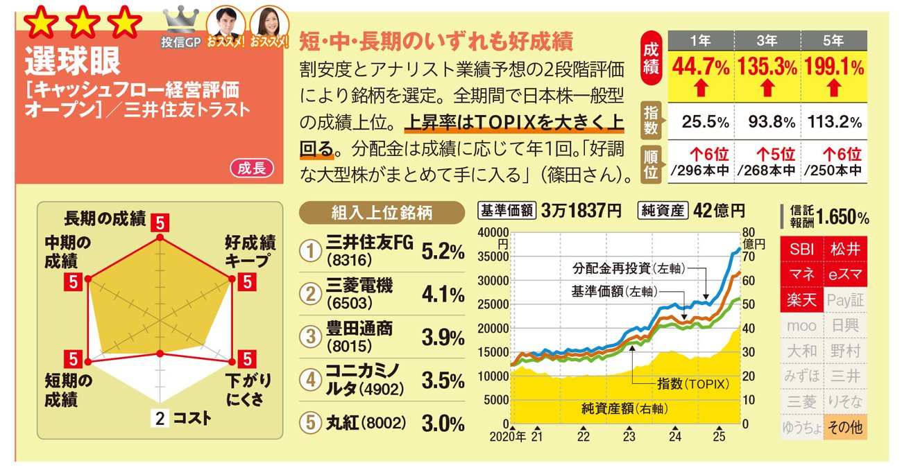 1つ目の日本株型おススメ投信は「選球眼[キャッシュフロー経営評価オープン]」(三井住友トラスト・アセットマネジメント)だ。