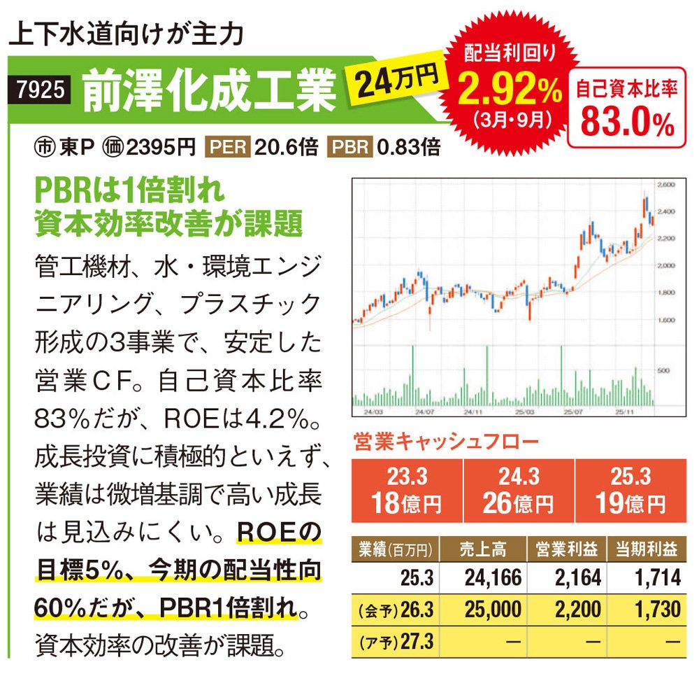前澤化成工業は、管工機材、水・環境エンジニアリング、プラスチック形成の3事業で、安定した営業キャッシュフローを維持。自己資本比率83%で、ROEは4.2%。成長投資に積極的といえず、業績は微増基調で高い成長は見込みにくい。ROEの目標5%、今期の配当性向60%だが、PBR1倍割れ。資本効率の改善が課題だ。