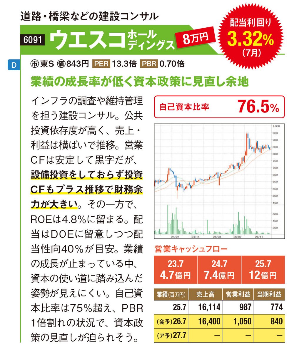 「株主還元余力の高い株」2つ目は、建設コンサルのウエスコホールディングス(6091)だ。
