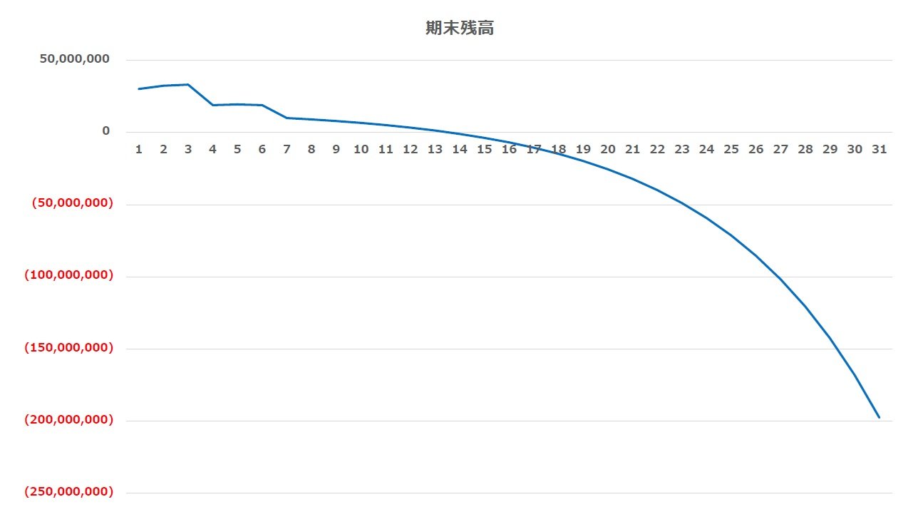 そのまま計算を続けると、30年後にはマイナス2億1000万円という意味不明な数字になります。「長期で見れば増える」という常識は、取り崩し期には通用しません。