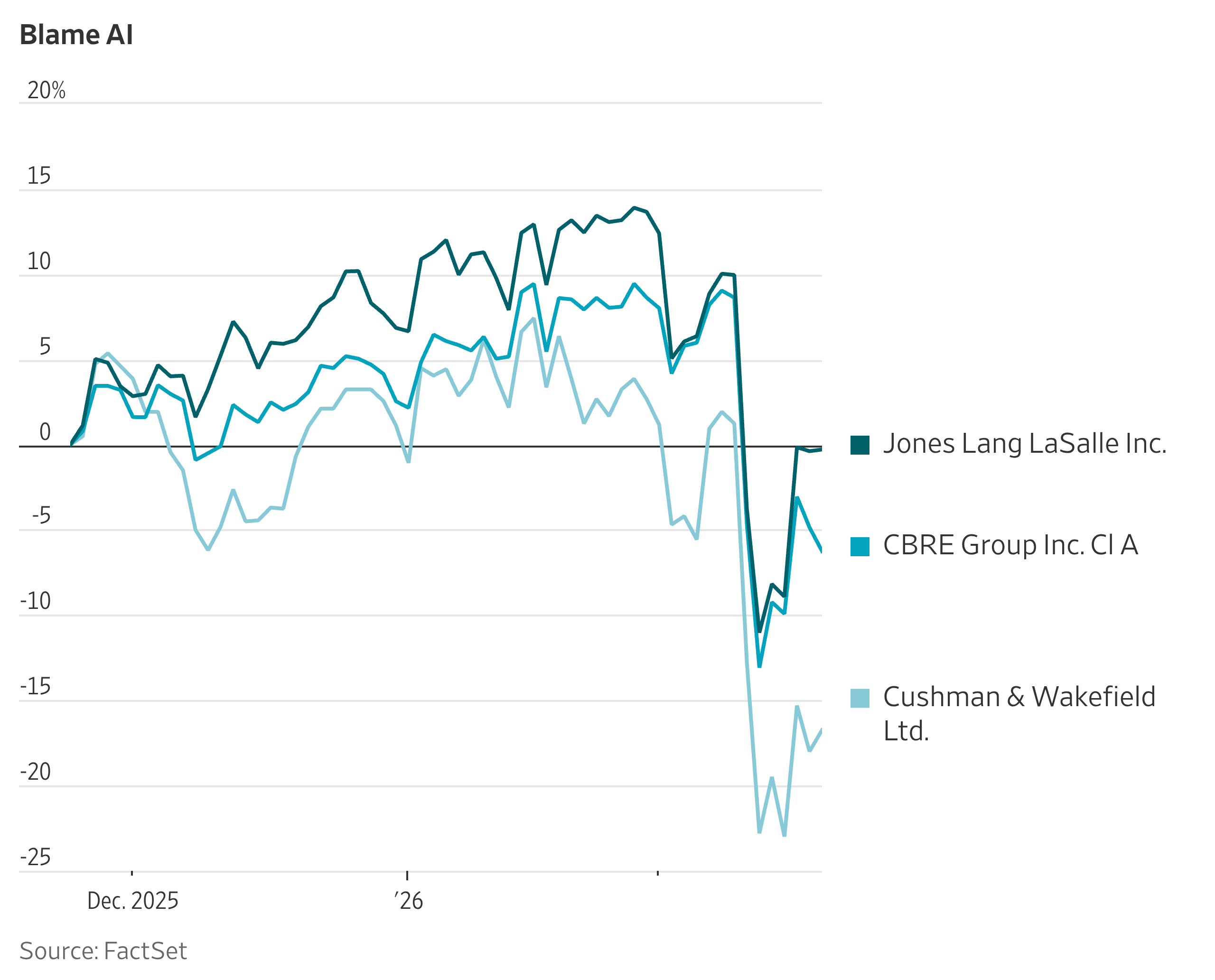 米国で商業用不動産を手掛ける企業は厳しい戦いを強いられている。店舗や倉庫、オフィスを売却するには人手が必要であることを投資家に納得させるための戦いだ。今、業界の将来が疑問にさらされている。投資家の間では、人工知能(AI)が不動産仲介業界の収益性の高いアドバイザリー手数料やコミッションを侵食し、鑑定などニッチなビジネスが事実上消滅するのではないかとの不安が広がっている。多くの投資家はすでに不動産株を投げ売りしている。世界最大の商業用不動産サービス会社であるCBREグループは、昨年10-12月期(第4四半期)の売上高や利益が過去最高に達し、2026年についても予想を上回る見通しを発表したにもかかわらず、発表当日に株価が8.8%下落した。決算発表があった週にも、発表日までに12%近く値を下げていた。