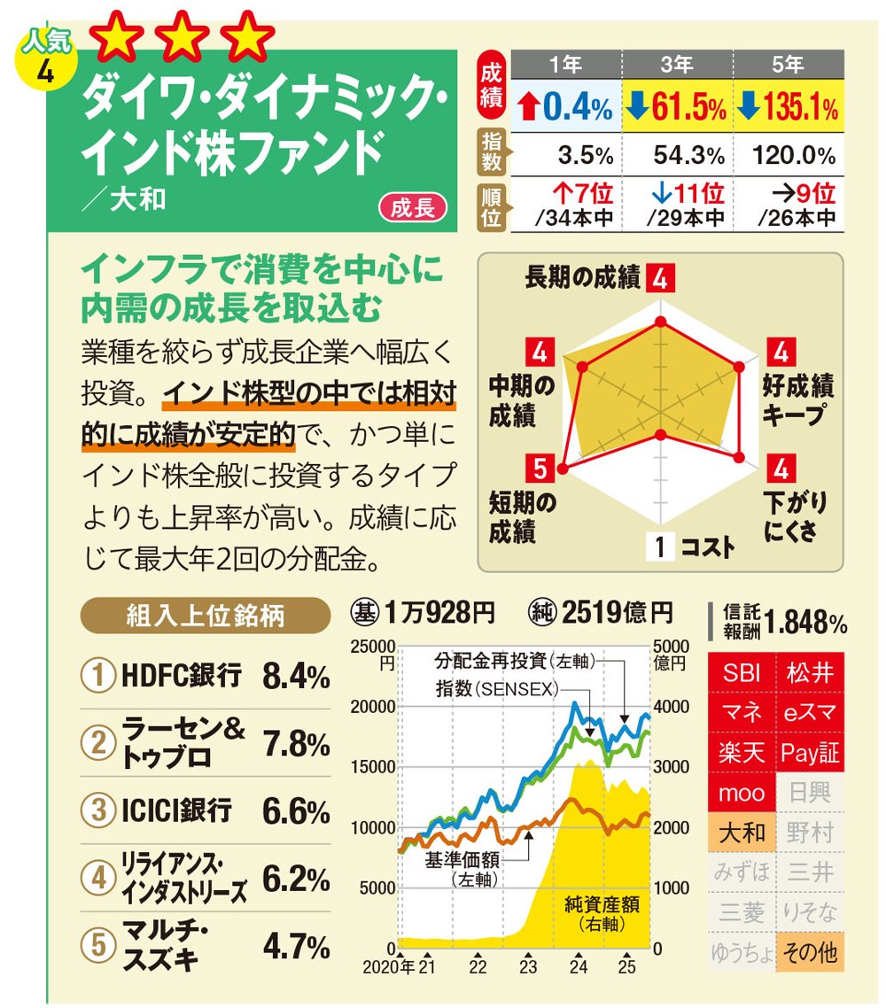 「ダイワ・ダイナミック・インド株ファンド」は、業種を絞らず成長企業へ幅広く投資。インド株型の中では相対的に成績が安定しており、なおかつ単にインド株全般に投資するタイプよりも上昇率が高い。成績に応じて最大年2回の分配金を出す。