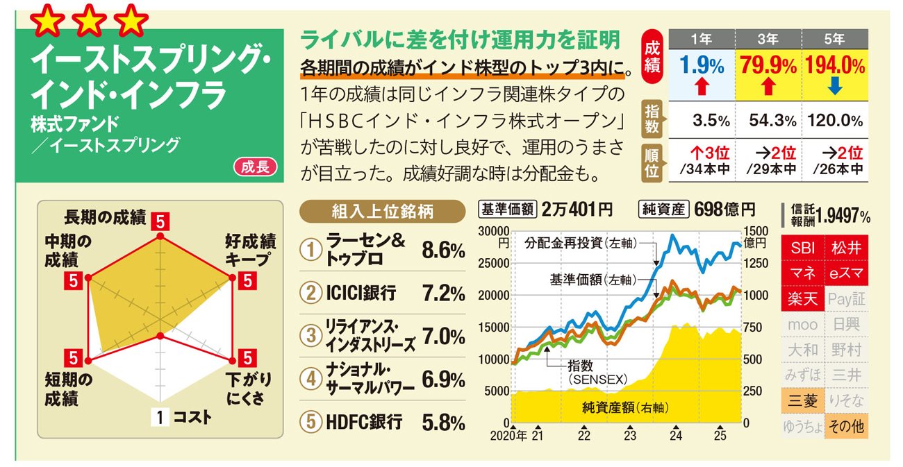 「イーストスプリング・インド・インフラ株式ファンド」は、短期・中期・長期のいずれの期間でも、成績がインド株型の投信でトップ3内。ここ1年の成績は、インド株全体が軟調だったにもかかわらず良好で、運用のうまさが目立った。成績好調なときは分配金も出る仕組みになっている。