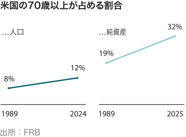 人口動態や企業利益の増加、資産価値の高騰が一体となって米経済に静かな変革を引き起こしている。その多くは今や、高齢者の手中にある。米連邦準備制度理事会(FRB)のデータによると、2025年7-9月期時点で、70歳以上の人は、米国の家計が保有する株式・投資信託全体のうち約39%を管理していた。2007年は22%だった。純資産(資産から負債を引いたもの)に占める70歳以上の割合は32%と、20年前の20%から上昇した。これは良いニュースだ。米国で高齢者となるのにかつてこれほど良い時代はなかった。しかし同時に、国の優先順位のちぐはぐさも露呈している。経済の痛みに効くツボはそこではないのに、高齢者の快適さと幸福のために、われわれはリソースを注ぎ続けている。