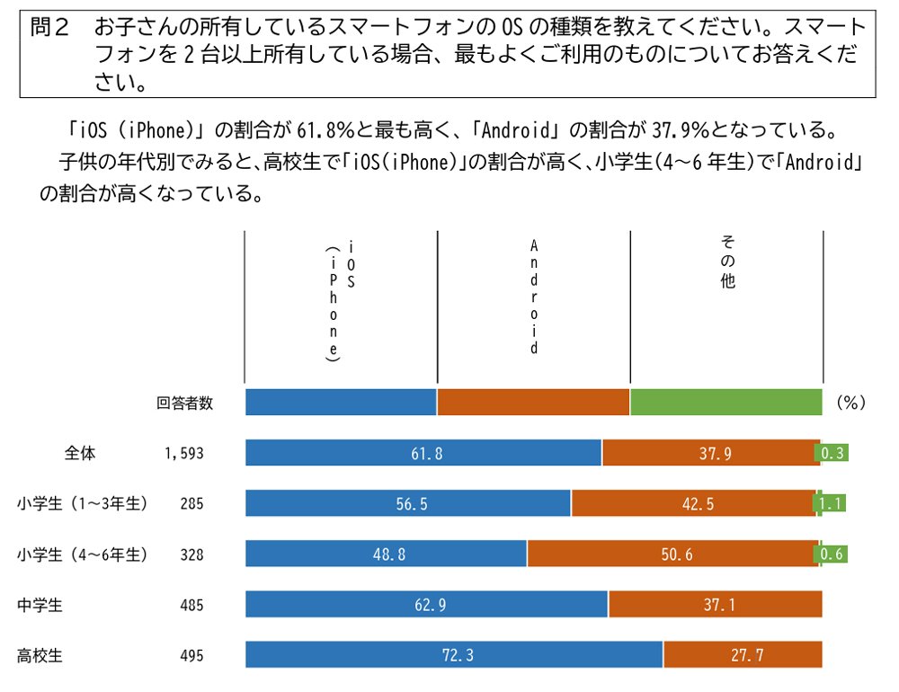 本調査によると、小学生から高校生の全体では、「iOS(iPhone)」が61.8%ともっとも高く、「Android」が37.9%となっています。学年が上がるほどiOSの割合が高くなり、高校生では72.3%がiOSを利用しています。小学生はAndroidが過半数を超えている学年もありますが、中高生になるとiPhone率が上昇するため、「友達もiPhoneに変えてもらった!みんなiPhoneだ!」と羨ましく思う子ども達がいるのでしょう。