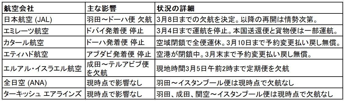 日本発着の主な中東関連便の状況(3月4日時点) 筆者作成拡大画像表示