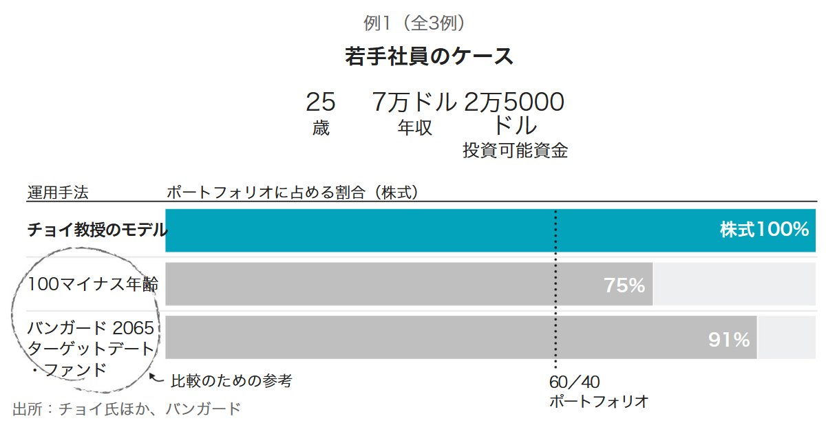 また、株式と債券を60対40に分ける古典的な手法や、100から年齢を引いた数値を株式の保有比率にするといった従来の経験則よりも、個人の財務状況をより多く考慮している。多くの人は単に、退職予定年に基づいたターゲット・デート・ファンドに判断を委ねている。