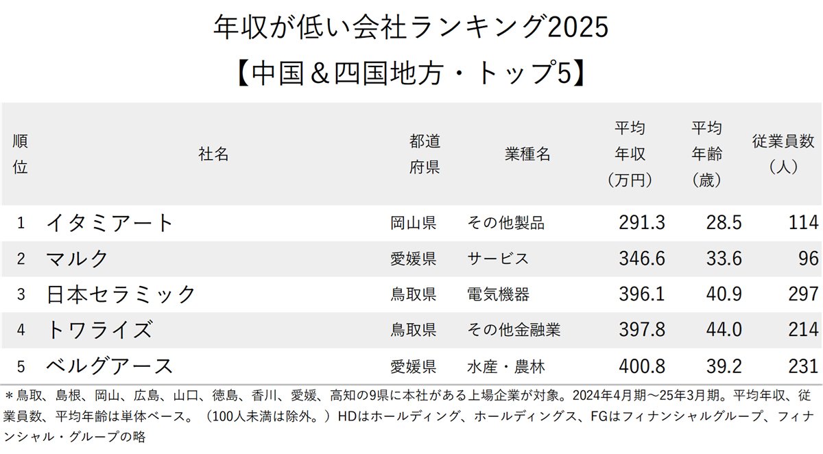 今回は、上場企業の有価証券報告書に記載された平均年収のデータを使って、中国&四国地方(鳥取、島根、岡山、広島、山口、徳島、香川、愛媛、高知の9県)に本社がある上場企業を対象に「年収が低い会社ランキング2025【中国&四国地方】」を作成した。単体の従業員数が50人未満の企業は除外している。対象期間は、2024年4月期~25年3月期。